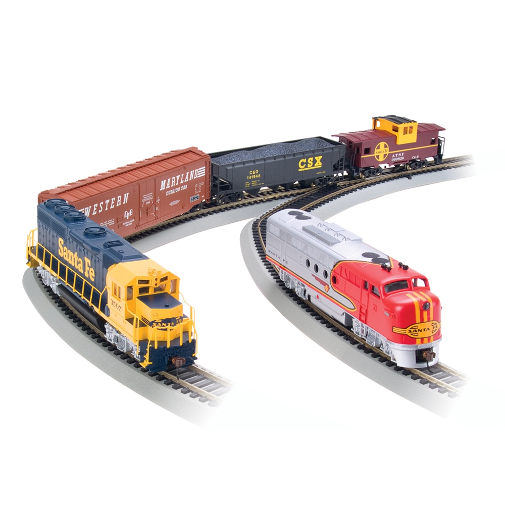 • 56" x 38" (143 cm x 97 cm) oval of snap-fit E-Z Track (including 12 pieces of curved track, 4 pieces of straight track, 1 plug-in terminal re-railer, 1 manual turnout - left, under-track magnet with brakeman figure and 1 Hayes bumper)