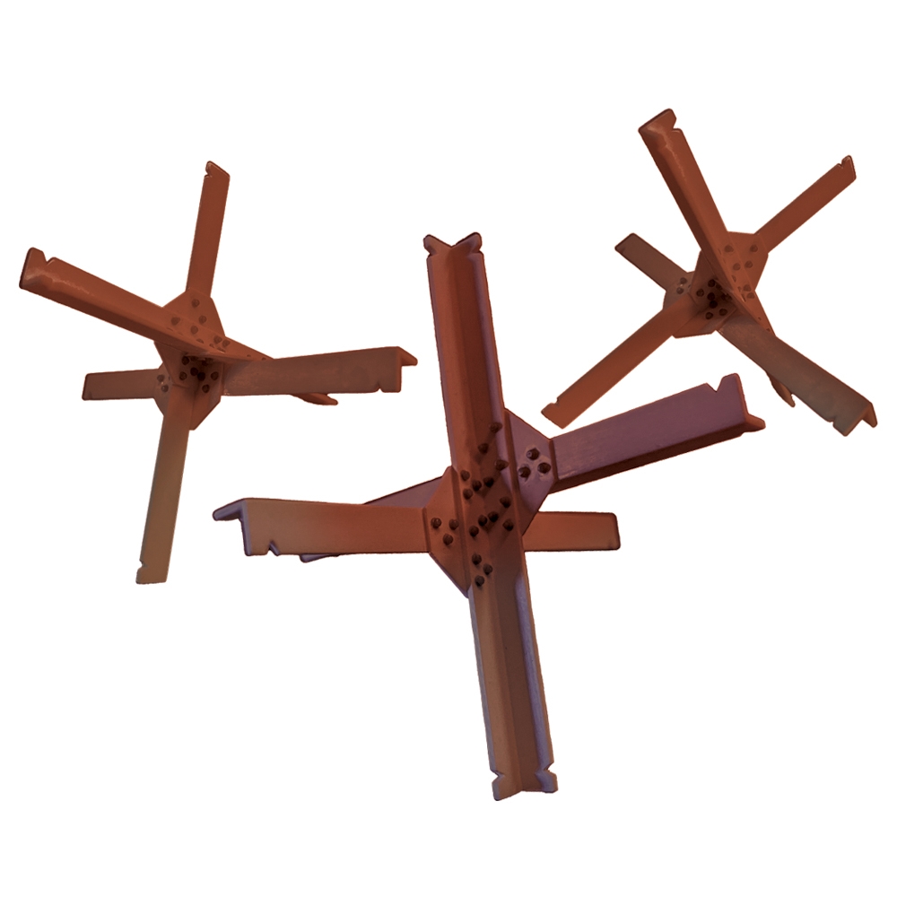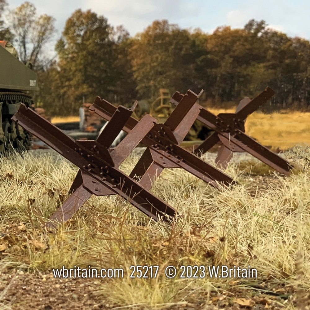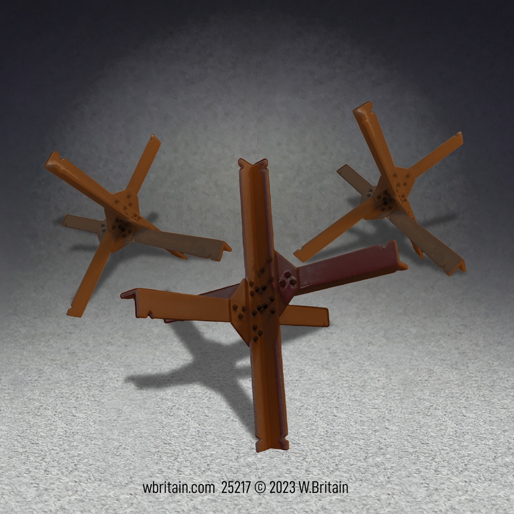The caltrop was the inspiration for the anti-tank obstacle, the hedgehog. They were widely used during WWII notably by the Soviets in front of Moscow (they were especially effective in urban combat, where a single hedgehog could block an entire street) and on Germany’s Atlantic Wall. Industrially manufactured, hedgehogs were typically made of three pieces of metal angle bar about 6' in length, weighing over 400 lbs each, two of which were joined together at the factory while the third arm was connected on-site with rivets and bolts. Notches for attaching barbed wire were cut into the arms. When not anchored to the ground they “rolled” under any vehicle attempting to drive over them, impaling their victim, much like the ancient caltrop.