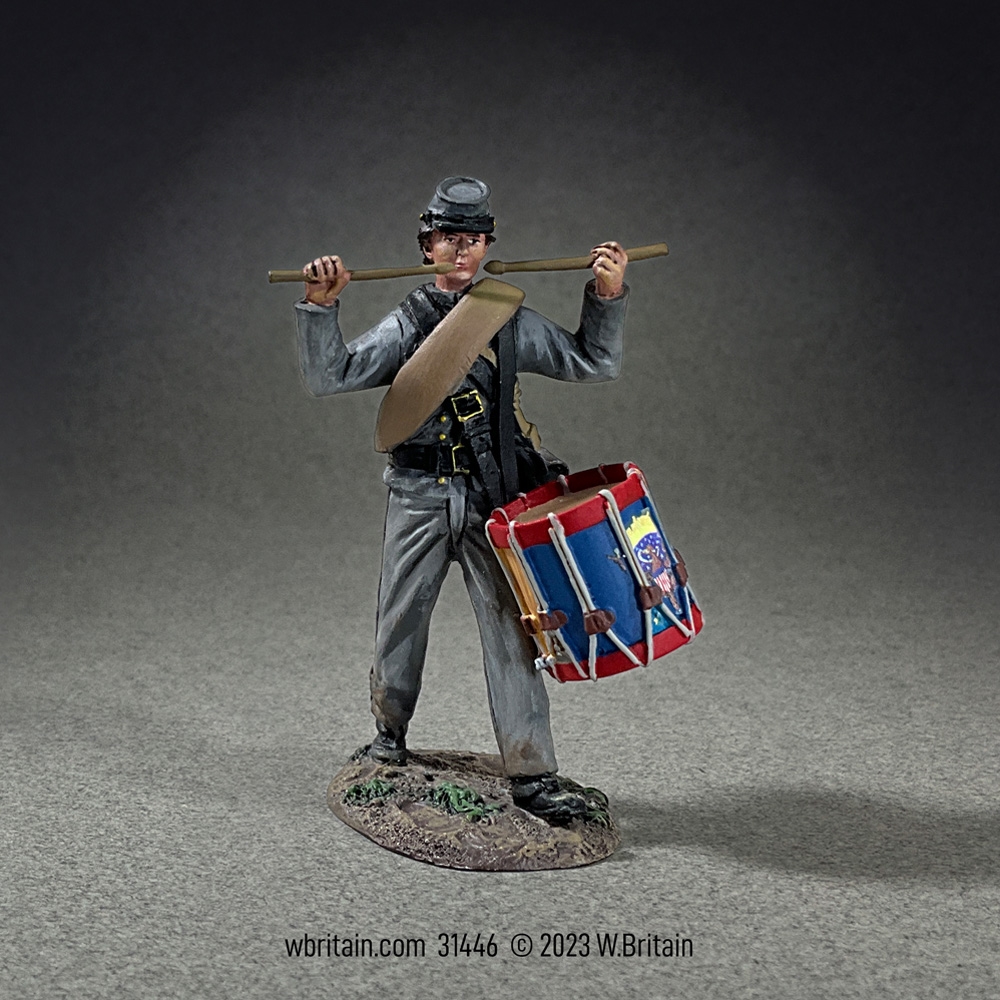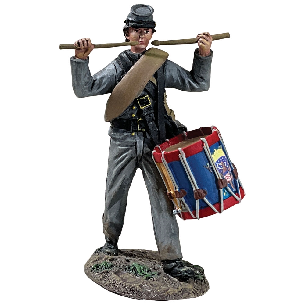 A civil war Fife and Drum Corps would include a Drum Major, Fifers, and Drummers playing both the snare drum and bass drum. Normally attached to a regiment, the size of the Fife and Drum Corps would range from as little as seven or eight to as large as 20 men. The responsibility of the Fife and Drum Corps was to perform music in camp, on the march, and in battle – as well as help move injured to field hospitals immediately following the engagement. This Confederate drummer plays a repurposed circa War of 1812 Eagle Pattern snare drum made of pliable woods nailed together, with calfskin or sheepskin stretched over each end and held in place with hoops and tension rope. The instrument was loud and was intended to be heard over the roar of battle.