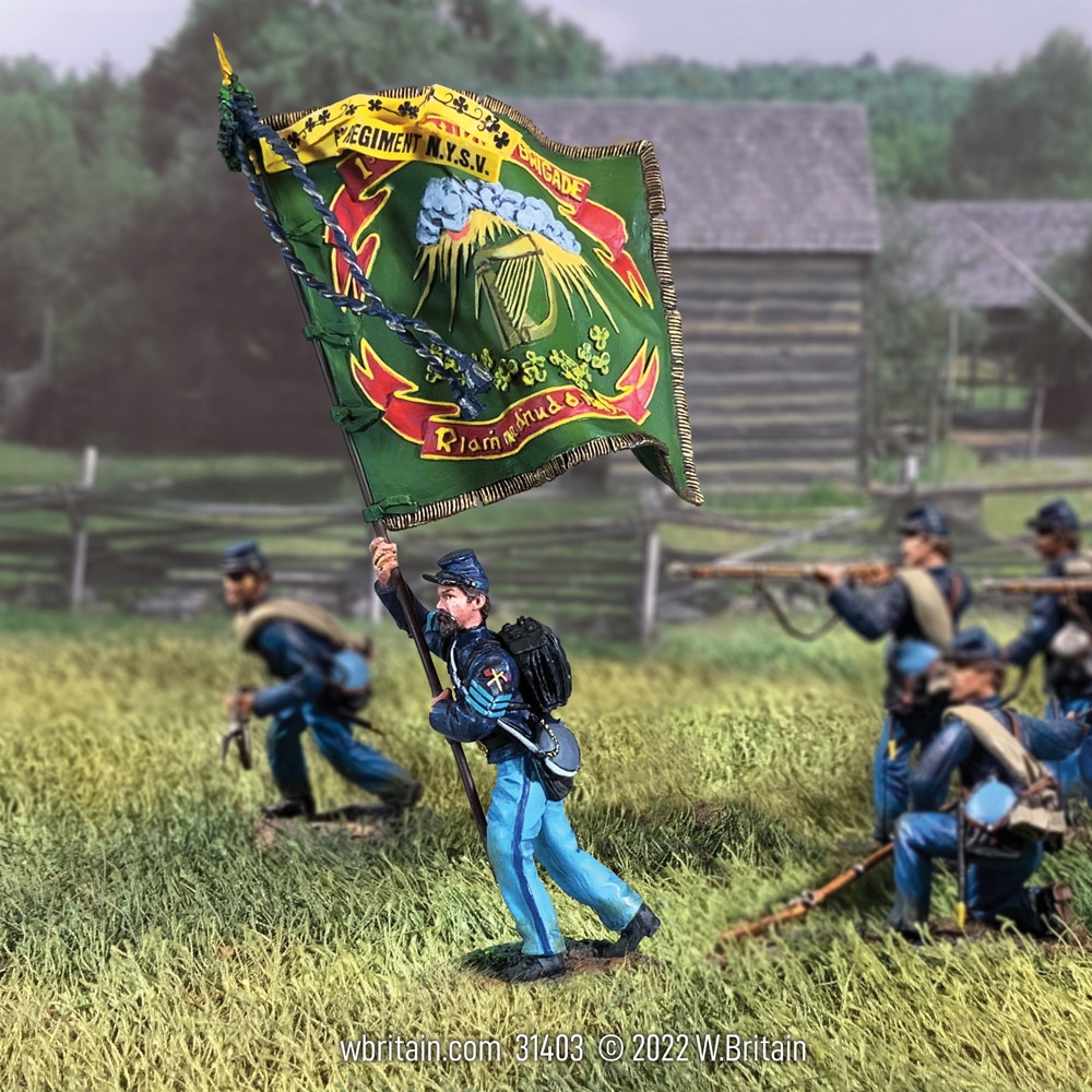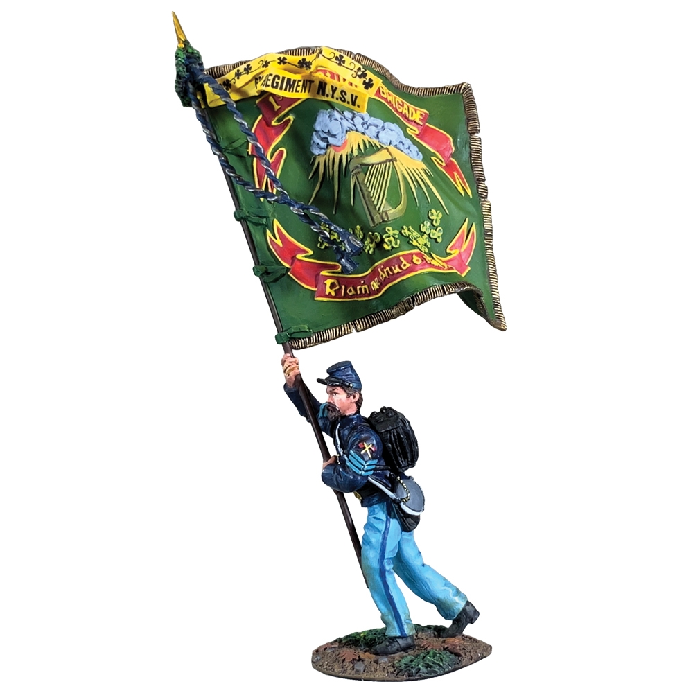 The formation of the Irish Brigade was authorized by the Secretary of War, Simon Cameron, in September 1861. The brigade originally consisted of the 63rd New York Infantry, the 69th New York Infantry, and the 88th New York Infantry. The three New York regiments were soon joined by a regiment from Massachusetts, the 29th. This Union NCO carries the Irish Brigade flag of the 69th New York Infantry Regiment, affectionately referred to as the “Fighting 69th.” The Irish Brigade was known in part for its famous war cry Faugh A Ballagh, which is an Irish phrase meaning “Clear The Way.” The Irish Brigade participated in almost all the engagements of the Army of the Potomac during the civil war suffering horrific casualties.