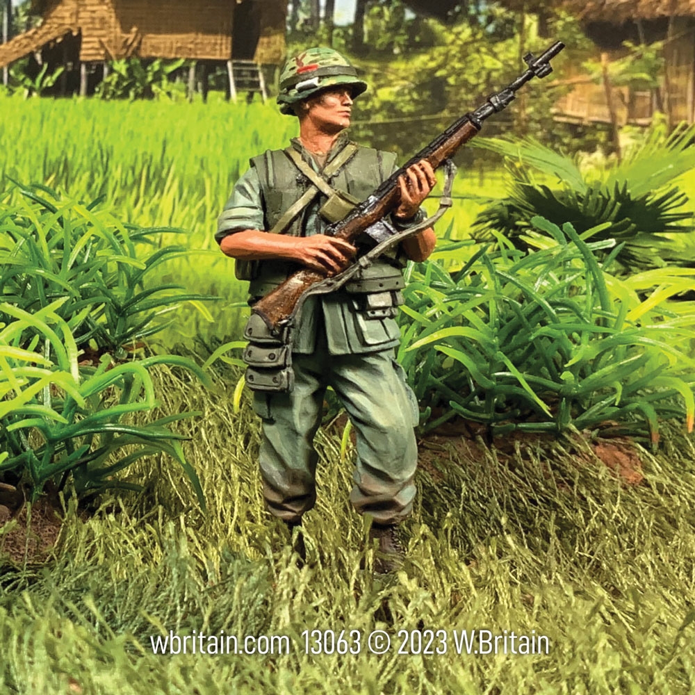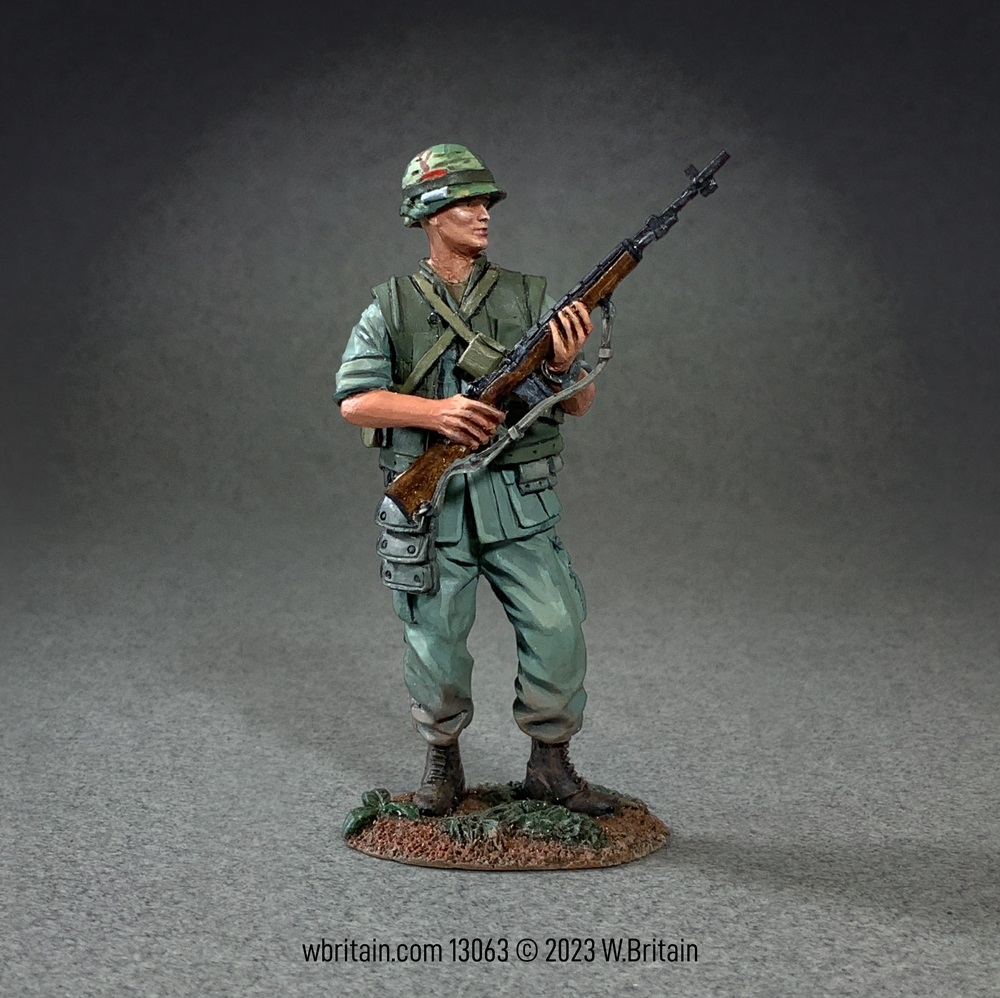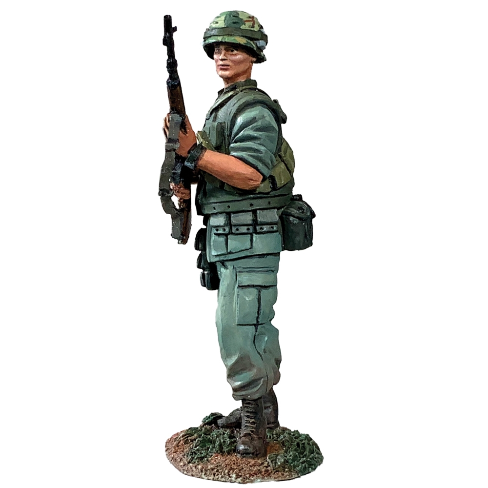 On 22 February 1965, General W.C. Westmoreland, Commander, U.S. Military Assistance Command Vietnam, requested two Marine battalions to protect the Da Nang airbase from the increasing threat by the Viet Cong. By early March, the 9th Marine Expeditionary Brigade landed there and by the end of March, 5,000 Marines had taken up position. By war’s end in 1975 nearly 500,000 Marines would serve in Southeast Asia. This figure appears as he would have during the early stages of the war with his standard green combat fatigues, vest, M1 combat helmet and M14 rifle. From his belt hangs a three pocket pouch for fragmentation grenades, a hold over from the Second World War.