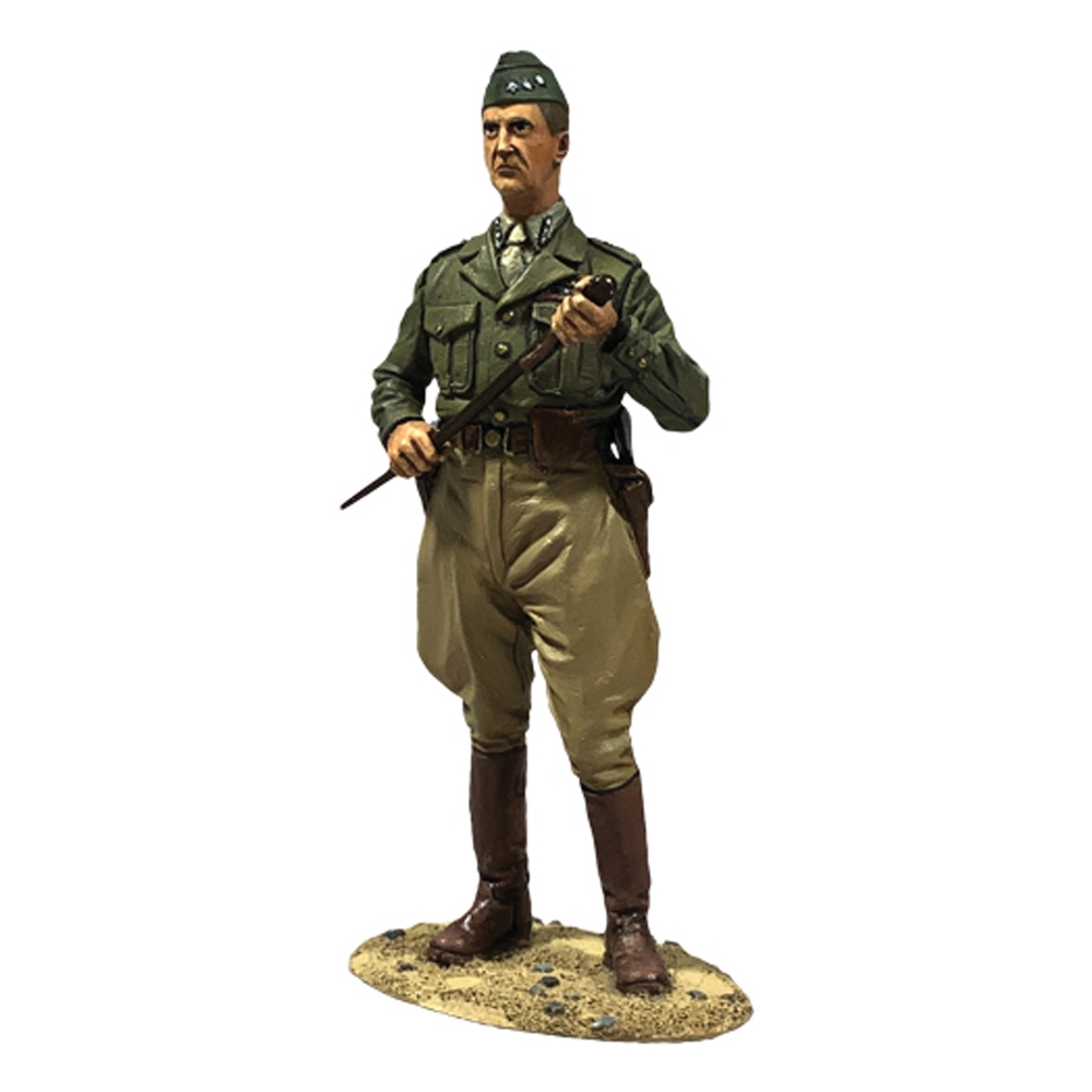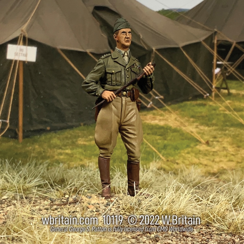 Born in 1885, George Smith Patton Jr. attended the Virginia Military Institute and the United States Military Academy at West Point. He studied fencing and designed the M1913 Cavalry Saber, more commonly known as the “Patton Saber.” As an athlete he competed in modern pentathlon in the 1912 Summer Olympics in Stockholm, Sweden. He served, and was wounded, commanding the fledgling tank corps in World War I. In WWII he obtained the rank of general and commanded the United States 7th Army in the Mediterranean theater. Following the Allied invasion of Normandy in June 1944, he led the United States 3rd Army in France and Germany. Patton’s colorful image, hard driving personality, and success as a battlefield commander cements his reputation as one of America’s most iconic generals.