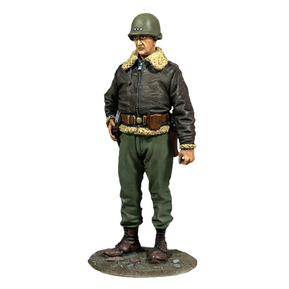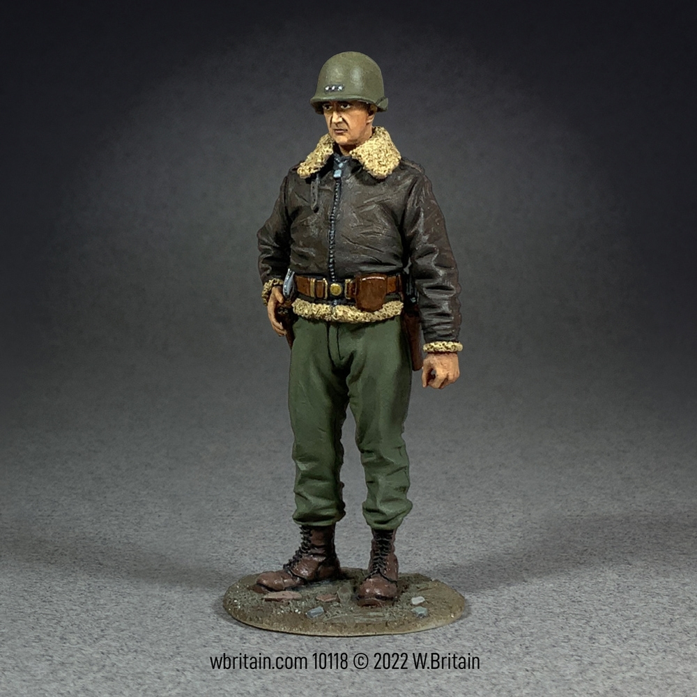 In December 1944, Germany launched a last-ditch assault across Belgium and northeastern France in the Ardennes Offensive, also known as the Battle of the Bulge. Met with initial success the drive was stalled by determined allied resistance, notably at the now surrounded crossroads town of Bastogne, Belgium. On 26 Dec., General George S. Patton launched an audacious plan to relieve the defenders of Bastogne. Employing a complex and shrewd strategy, he directed his Third Army to make a fierce counter-thrust movement and broke through the German lines, relieving the valiant defenders and ultimately pushing the Germans east across the Rhine. Here Patton wears a B-3 Bomber Jacket with his famous ivory handled, 45 caliber, Colt Model 1873 Single Action Army Revolvers on the hip.