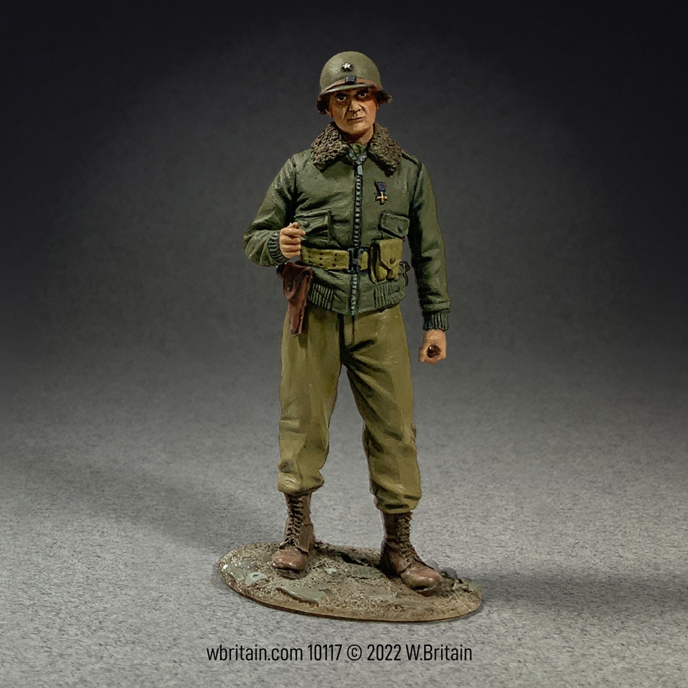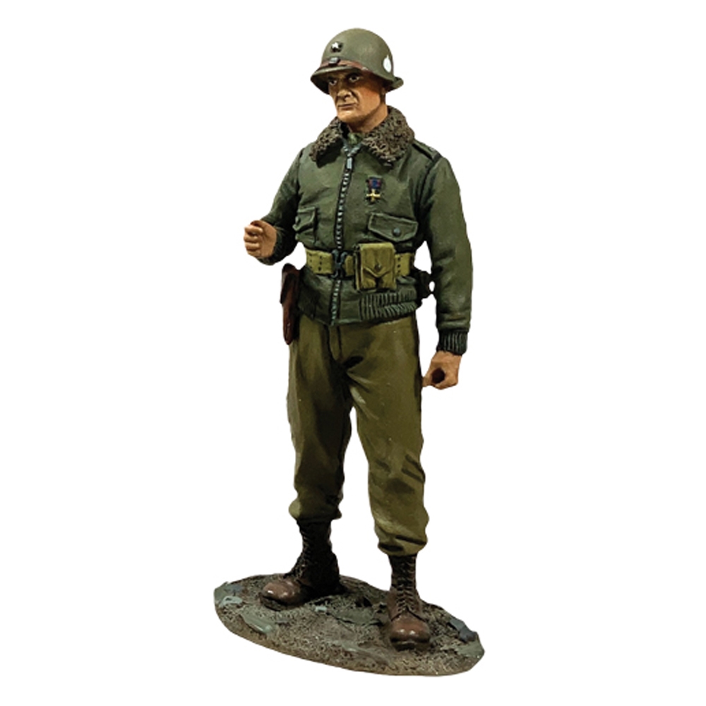 General McAuliffe was a senior United States Army Officer who earned fame as the acting commander of the 101st Airborne division during the Battle of the Bulge. He is celebrated for his one-word reply of “Nuts!” to a German surrender ultimatum. Following the war, McAuliffe held many positions including Chief Chemical Officer of the Army Chemical Corps and Head of Army Personnel. In 1953 he returned to Europe as commander of the 7th Army and Commander-in-Chief of the United States Army Europe in 1955 when he was promoted to four-star general. This figure impression represents how General McAuliffe would have appeared winter of 1944-45 wearing a U.S.A.A.C. B-10 bomber jacket.