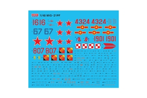 Canopy mask included. Choice of markings for 5 aircraft: (1) Russian Air Force MiG-21PF 'Red 16'; (2) Russian 4th demonstration AE MiG21PFM, 234th 'Proskurovskiy' Guards Fighter Regiment, Kubinka; (3) North Vietnam MiG-21PF 'Red 4324'; (4) Polish Air Force MiG-21PF '1901 Red', Warsaw; (5) East Germany MiG-21PF '807 Red' JG 9 'Heinrich Rau', Peenemünde, 1967.