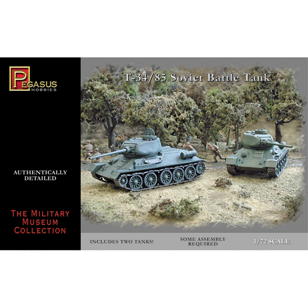 • T-34/85• 1:72 scale plastic model kit from Pegasus, requires paint and glue• Contents: 2 tanks