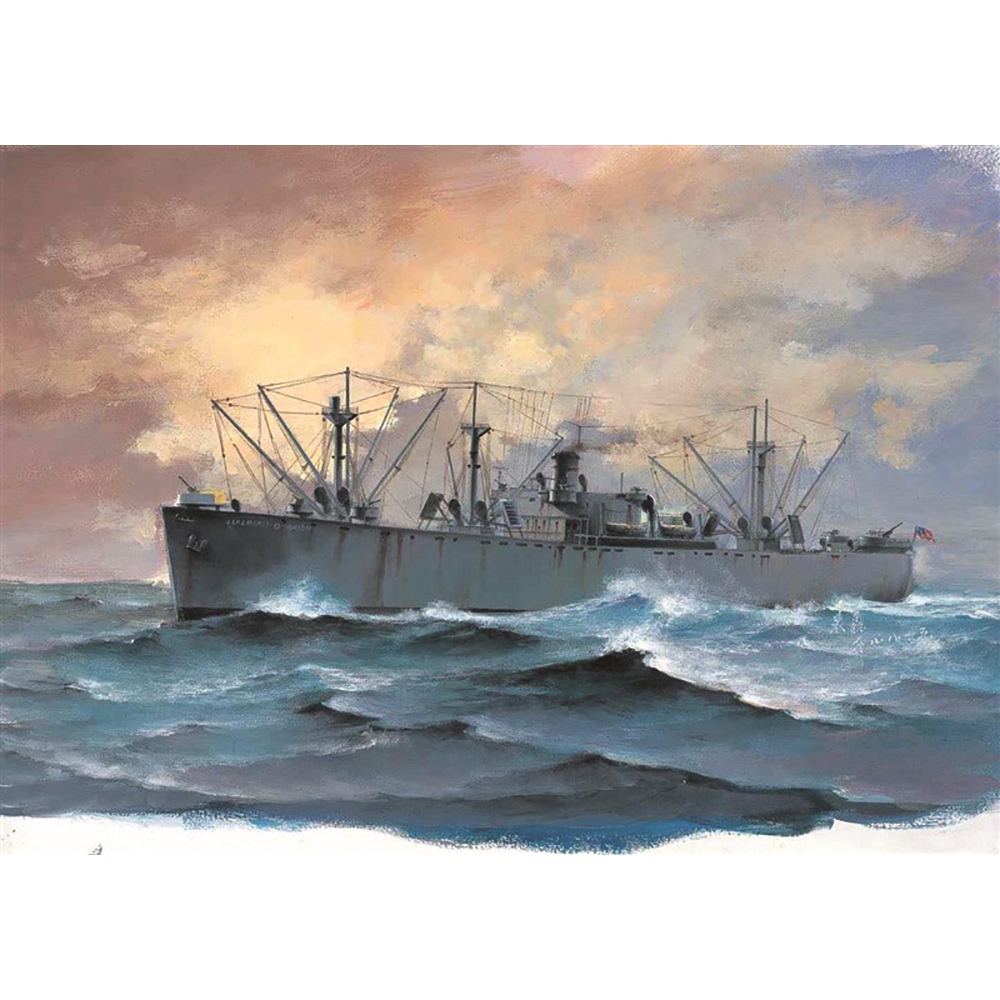 D-Day Liberty Ship. L: 192.2mm, W: 24.8mm Waterline plate. 1:700 scale plastic model kit from Trumpeter, requires paint and glue.