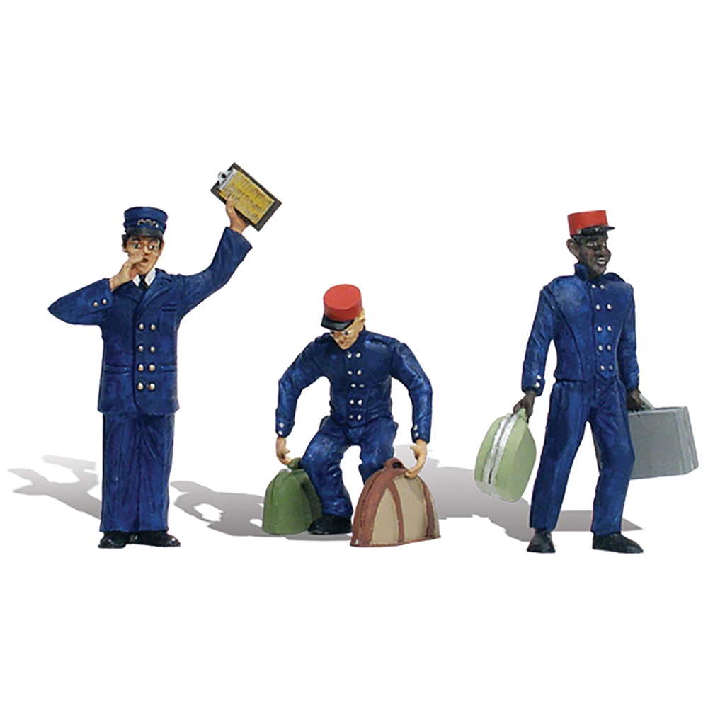 Remnants of the good old days: two porters and a conductor singing “all aboard!” Set contains 5 pieces. Colors may vary from actual product.