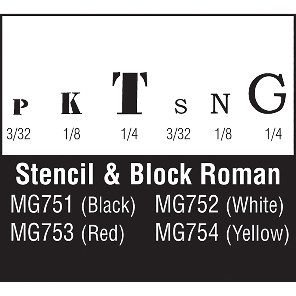 Stencil Letter sizes: 3/32", 1/8", 1/4" (2.38 mm, 3.17 mm, 6.35 mm).