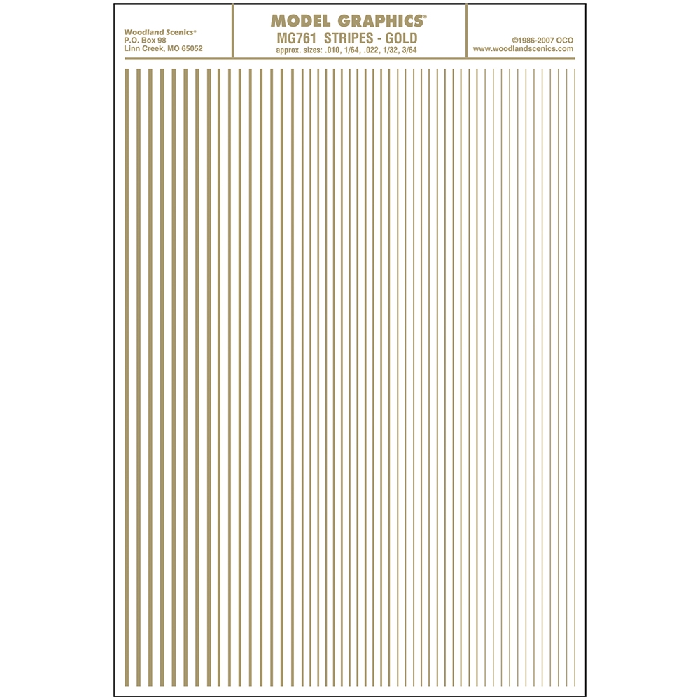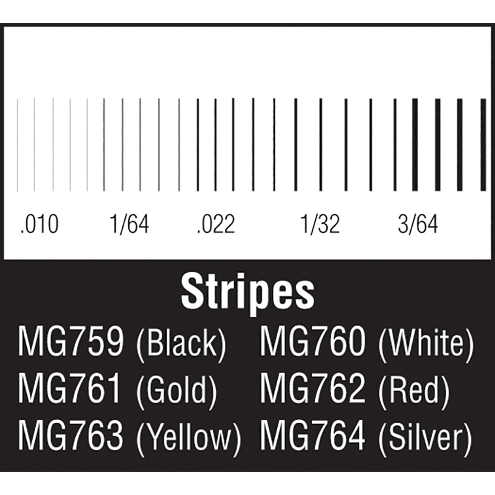 Stripe sizes: 0.01", 1/64", 0.022", 1/32", 3/64" (.25 mm, .39 mm, .55 mm, .79 mm, 1.19 mm).