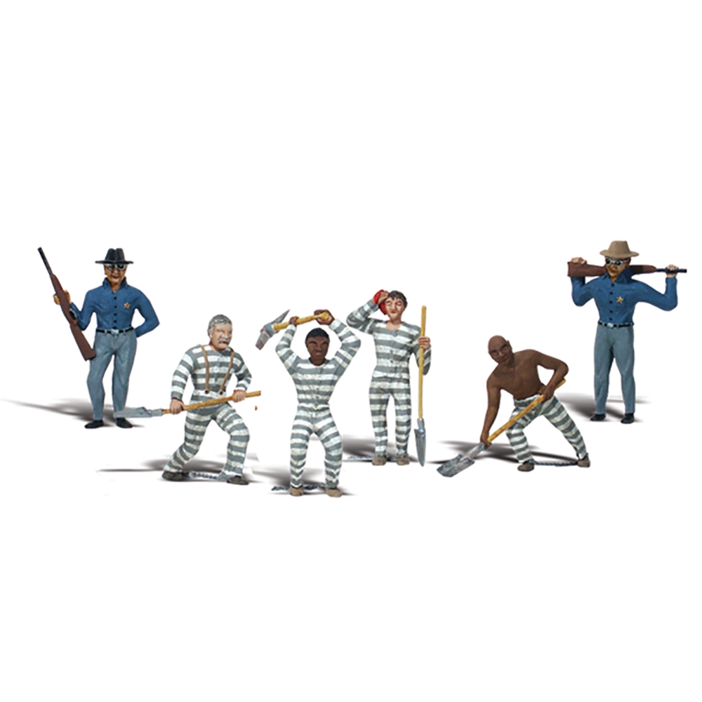 Two guards with guns stand watch over four inmates. One inmate leans on his shovel and wipes his brow while another stands holding his shovel. Another inmate swings a pickax overhead while the fourth inmate shovels. Set contains 6 pieces. Colors may vary from actual product.