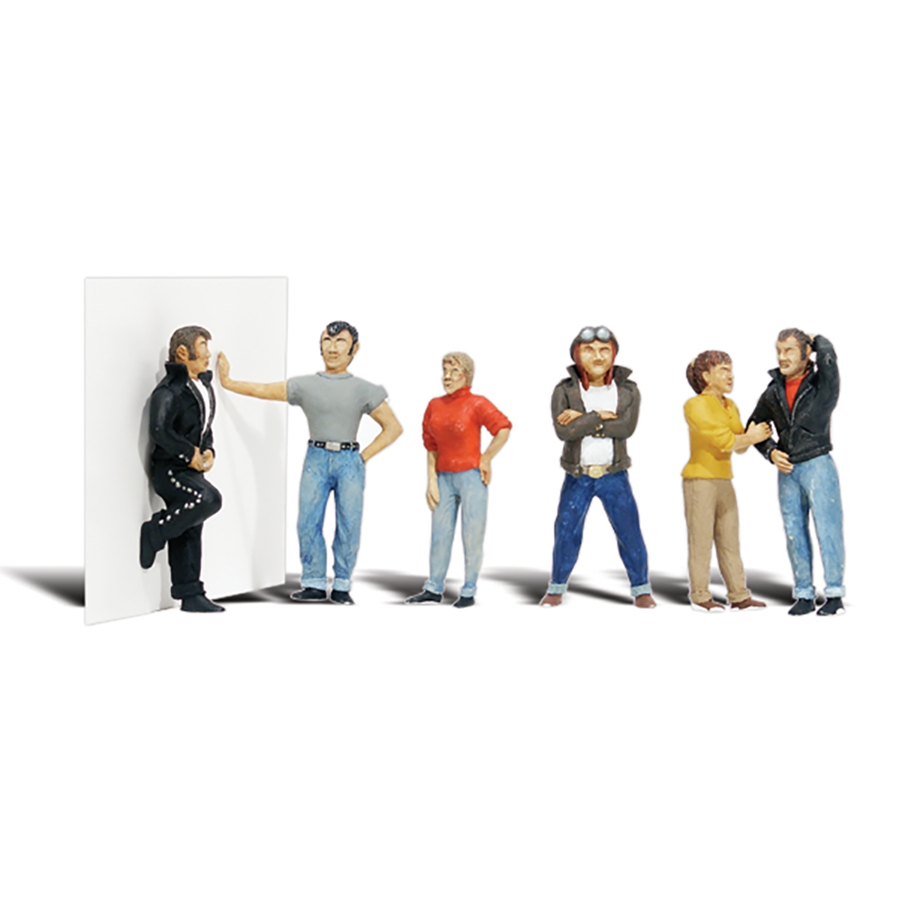 A cool couple stands together, arms entwined, while the man fixes his hair. Another couple stands together: his arms are crossed and her hand rests on her hip. One man leans with his hand on the wall. Another man adjusts his leather jacket. Set contains 6 pieces. Colors may vary from actual product.