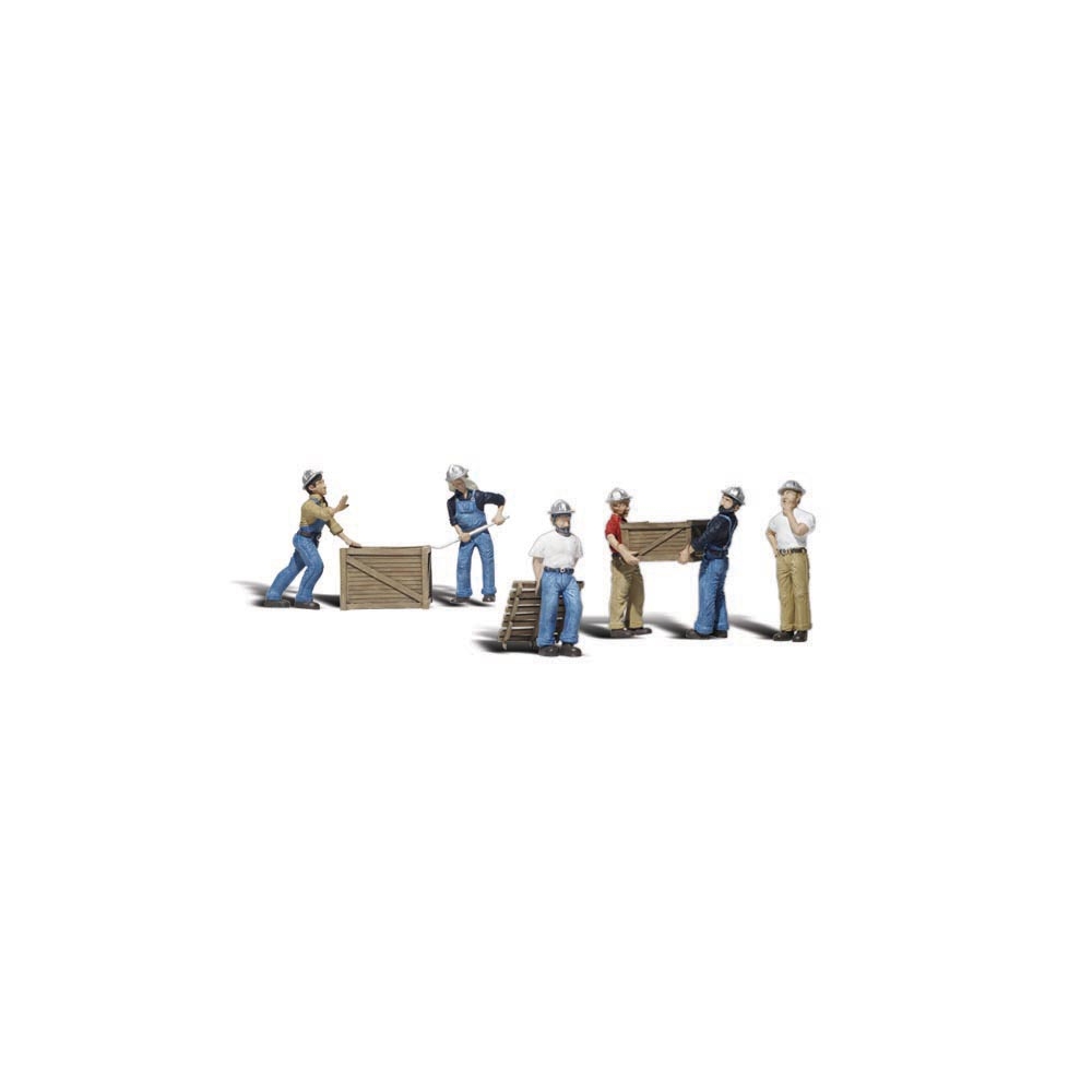 One dock worker is holding up his hand to signify stopping an operation. One is opening a crate, one is dragging a pallet, two are carrying a crate and another is looking up, surveying a project. Set contains 6 pieces. Colors may vary from actual product.