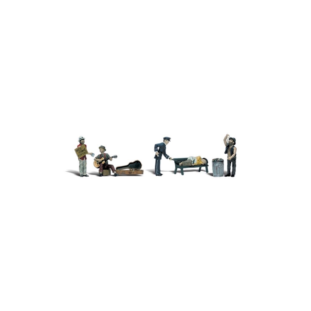 The policeman is getting ready to wake a sleeping bum on a park bench. There’s also a bum searching through the trash, one bum with a "need money for food" sign and one with a guitar. Set contains 7 pieces. Colors may vary from actual product.