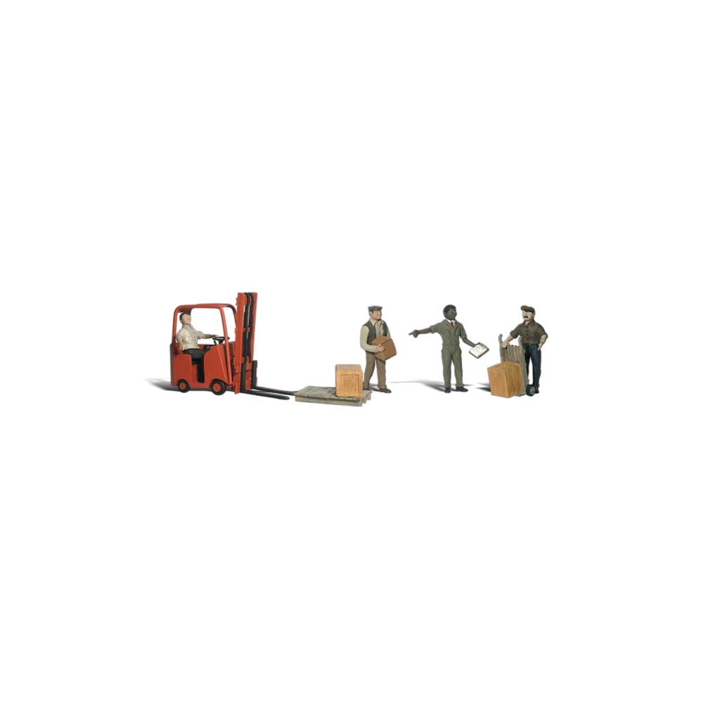 A scene of four men working: one is carrying a crate, one is using a dolly to move a large crate, one is supervising the job with his clipboard in hand and one is driving the forklift, about to lift the pallet. Set contains 8 pieces. Colors may vary from actual product.