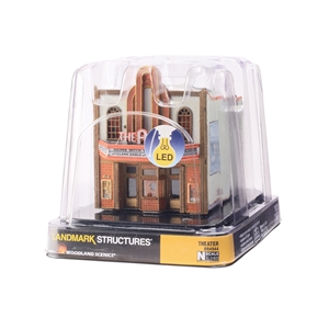The Theater offers classic vintage architecture, an expertly weathered stucco-over-brick exterior, tall arched windows, gilded kick plates on front doors, a decorative tile facade and carved wood trim. Window treatments and decals are included. This building features a first-floor printed interior, a lighted marquee, and one interior light. See photos for footprint. The installed LED lighting is made for use with the Just Plug ® Lighting System. 45mA RoHS Compliant. Colors may vary from actual product.