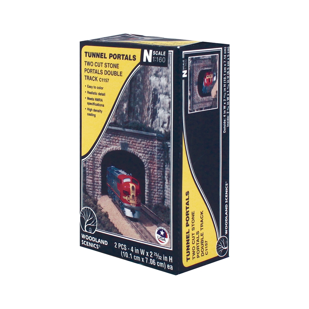 Give your tunnel a Cut Stone face. This double portal fits over two N scale tracks. Easy to color plaster castings. Color with Earth Colors™ Liquid Pigment. Set contains two pieces.