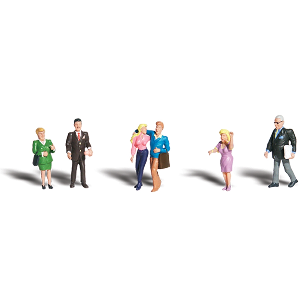The people in this set seem to be conversing. An elderly woman has a sweater over her arm. A man stands next to another woman with his arm around her shoulder. A woman waves, while two other men get about their business. Set contains 6 pieces. Colors may vary from actual product.