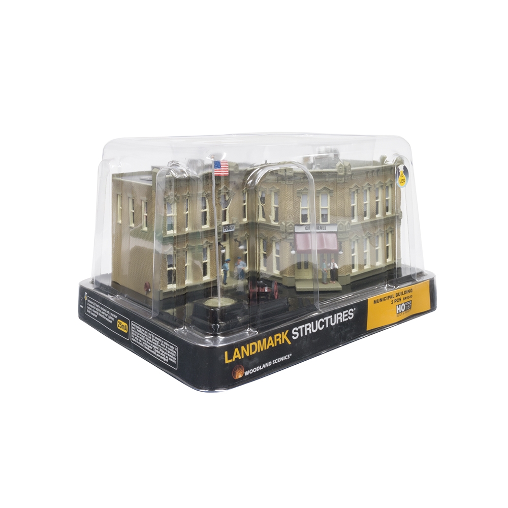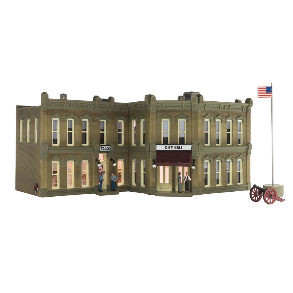 The Municipal Building is a two-story brick-patterned city hall and police station. Details include a printed interior, window shades, a propane tank, electric meter, awnings, exterior signage, drainage spouts, rooftop ductwork, and chimneys. The set includes a red metal canon and Old Glory waving atop a flag pole. See photos for footprint. The installed LED lighting was made for use with the Just Plug® Lighting System. 25mA RoHS Compliant. Colors may vary from actual product.