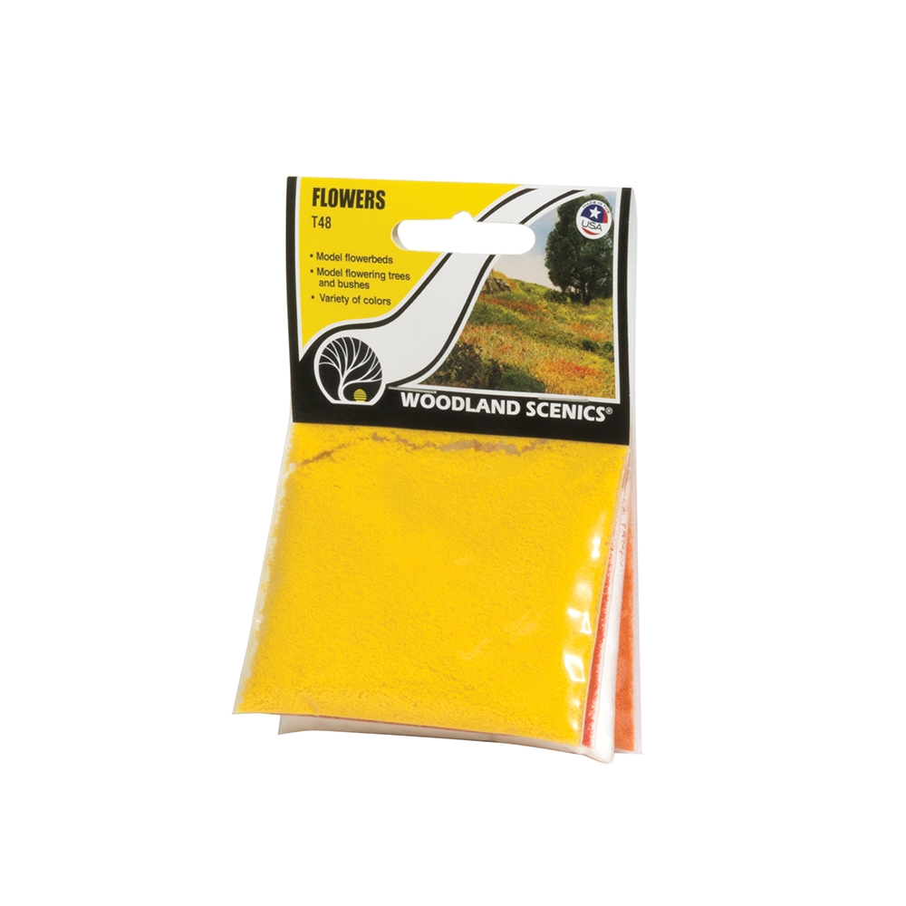 Yellow, white, orange and red flowers. Use to model realistic flowerbeds, flowering trees, bushes and vines. 4 bags/package - 1.8 in³ (29.4 cm³) per bag