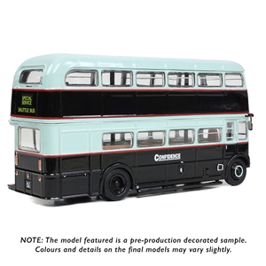 Our model depicts Routemaster registration WLT655, which has now spent almost 40 years as part of the Confidence Bus fleet in Leicestershire. The former RM655 entered London Transport service in April 1961 at Wood Green, spending much of the next decade working from there on Routes 127, 259 and 269. In 1981 it underwent overhaul at Aldenham where it received the Leyland 0.600 engine it still has today.