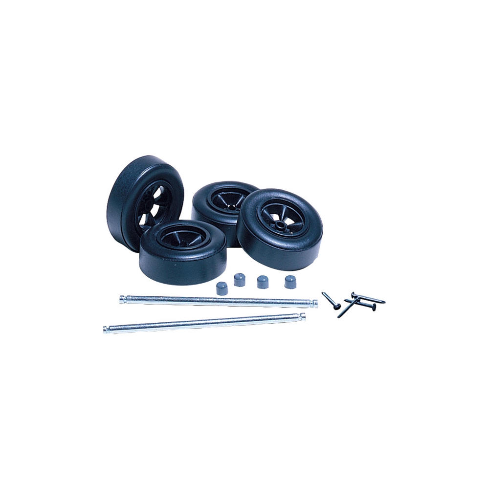 Contents:• 4 Wheels• 2 One-piece Axles• 4 Nail-type Axles• 5 Hubcaps