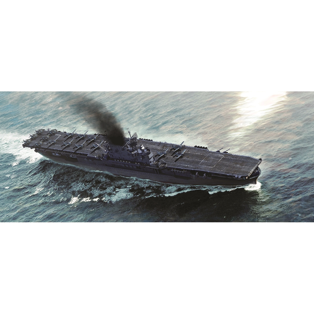 “Big E” USS ENTERPRISE was the second of the Yorktown Class aircraft carriers. Construction commenced in 1934 and official launch was in 1936, entering service in 1938. ENTERPRISE narrowly escaped the unannounced Japanese attack on Pearl Harbor on December 7, 1941 due to stormy weather. Without any further delay, ENTERPRISE was immediately tasked with combat duty against the Japanese. “Big E” provided cover for the Doolittle Raid on mainland Japan and took part in the Battle of Midway, Battle of Philippines, Leyte Gulf and provided air support during the Guadalcanal campaign, Gilbert Islands, Marshall Islands, Palau, Iwo Jima and Ryukyu. For a long period of time, “Big E” took on Japan until more aircraft carriers entered service. After WWII, “Big E” took part in “Operation Magic Carpet” and brought U.S. troops back to USA. Decommissioned in 1947, ENTERPRISE was dismantled in 1958 yet the legend of “Enterprise versus Japan” lives on. • L: 360.2mm, W: 48.5mm • Aircraft Wing includes TBD-1, SBD-3, F4F-4 • Total parts: 390+ • 1:700 scale plastic model kit from Trumpeter, requires paint and glue