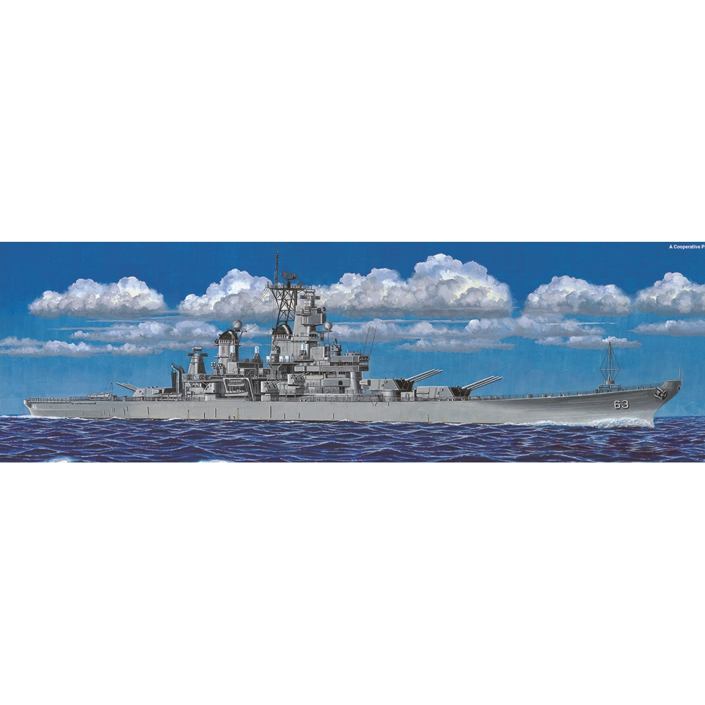 Iowa Class Fast Battleship. L: 386mm, W: 47mm, Waterline plate. 1:700 scale plastic model kit from Trumpeter, requires paint and glue.