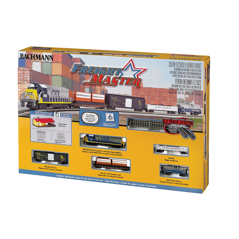 With a 3,000-horsepower engine and plenty of pulling muscle, the EMD GP40 diesel locomotive ensures that the Freightmaster delivers its goods on time. This 60-piece set includes a station, signs, and telephone poles to make you master of your own freight empire!