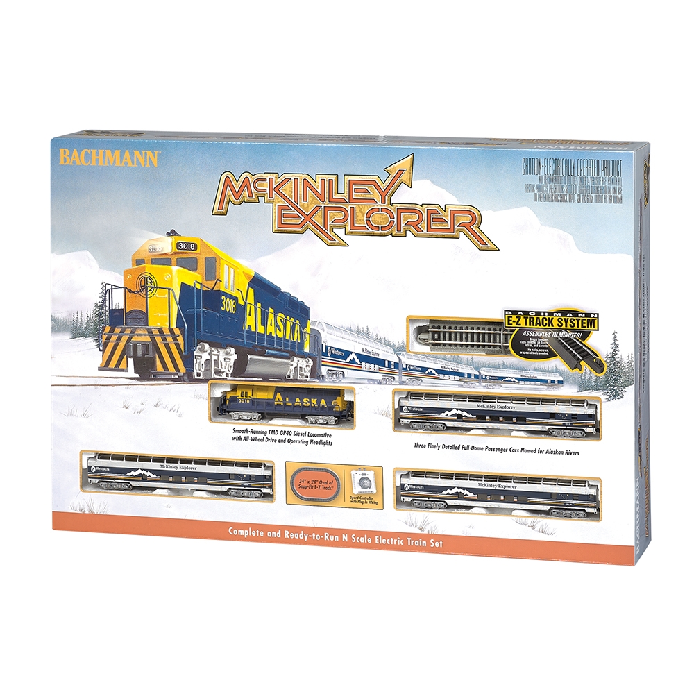Treating passengers to breathtaking views of the Alaskan wilderness in special vista-dome cars is the McKinley Explorer. Operating today from Anchorage to Fairbanks, and running past Denali National Park, this train's lucky riders might thrill to the sight of bear, moose, sheep and bald eagles. Now updated with a GP40 diesel, our N scale McKinley Explorer set comes complete with: