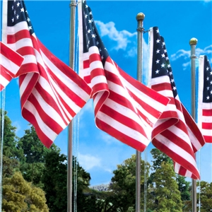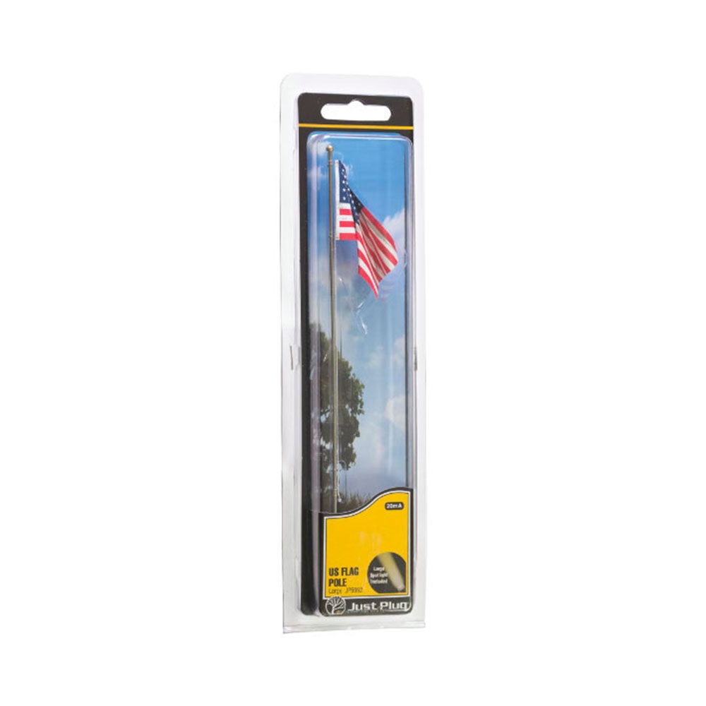 The product features a United States flag high on a flag pole. The pole is topped with a ball-style finial and includes a rope and cleat. US Flags include a Just Plug Spotlight to highlight the Flag. Spotlight is designed and ready to plug into the Just Plug Light Hub.